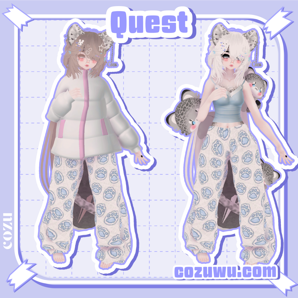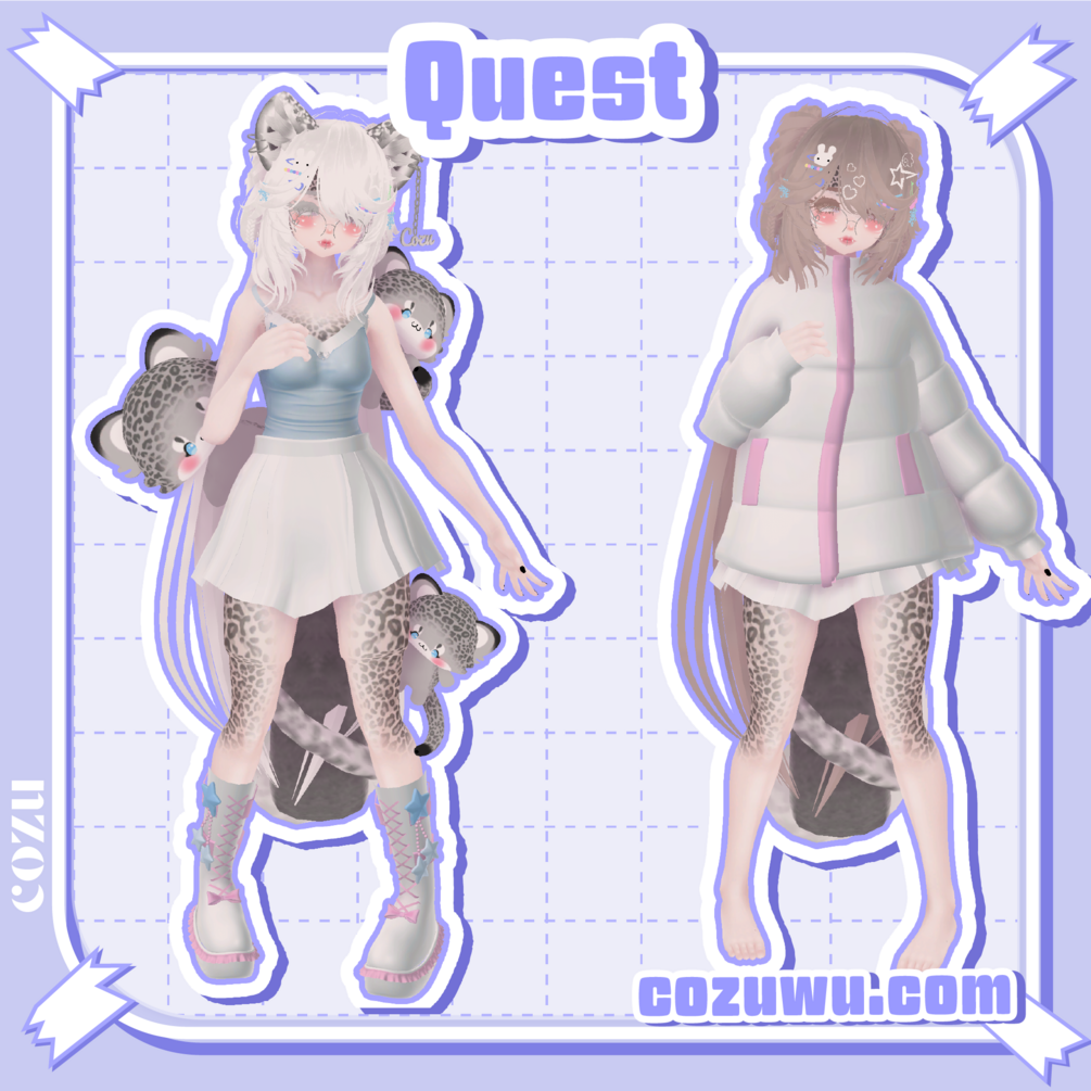IMPORTANT NOTE! The Quest version has been updated as of 1/21/25 for the physbones that weren't moving on the Quest side. PLEASE BE AWARE - the tail/breasts/buns of the hair/snow leopard pals on the quest side will be stiff unlike how it is in the showcase!
