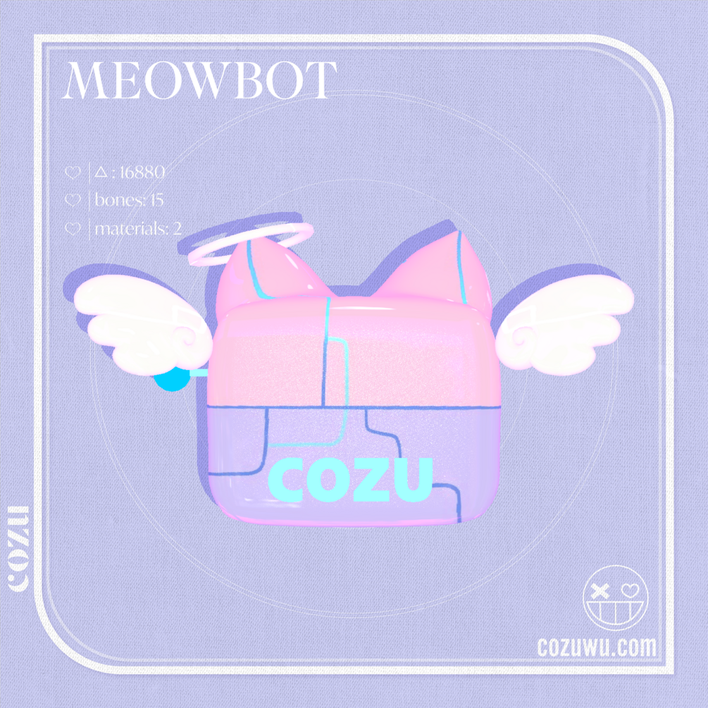 Cute little kitty bot follower! It has angel wings, halo, and a joystick that you can add interactions with. Meowbot comes with an angel wing flapping animation as well. STAR PARTICLES ARE NOT INCLUDED!! You can find those here! ♡